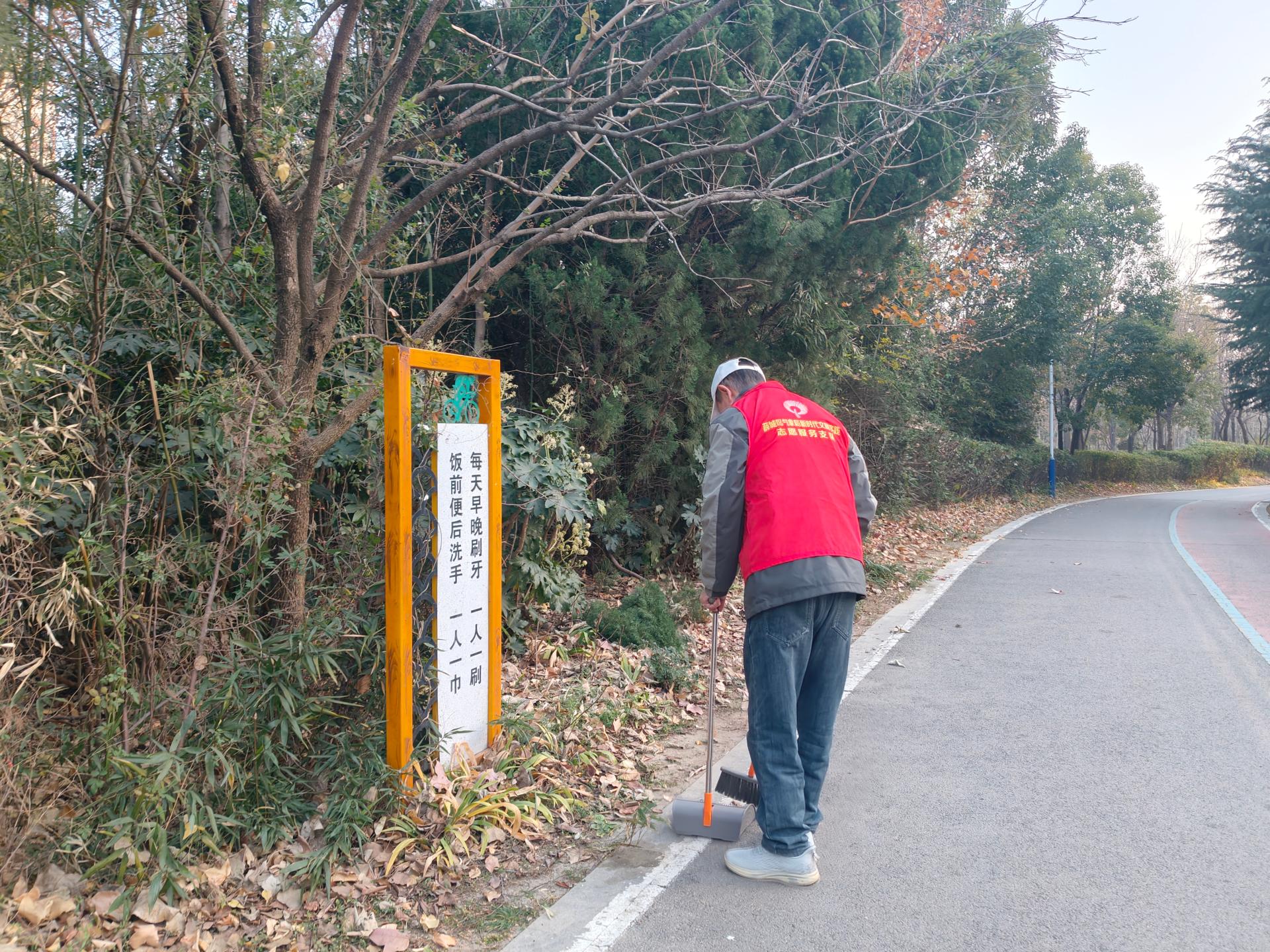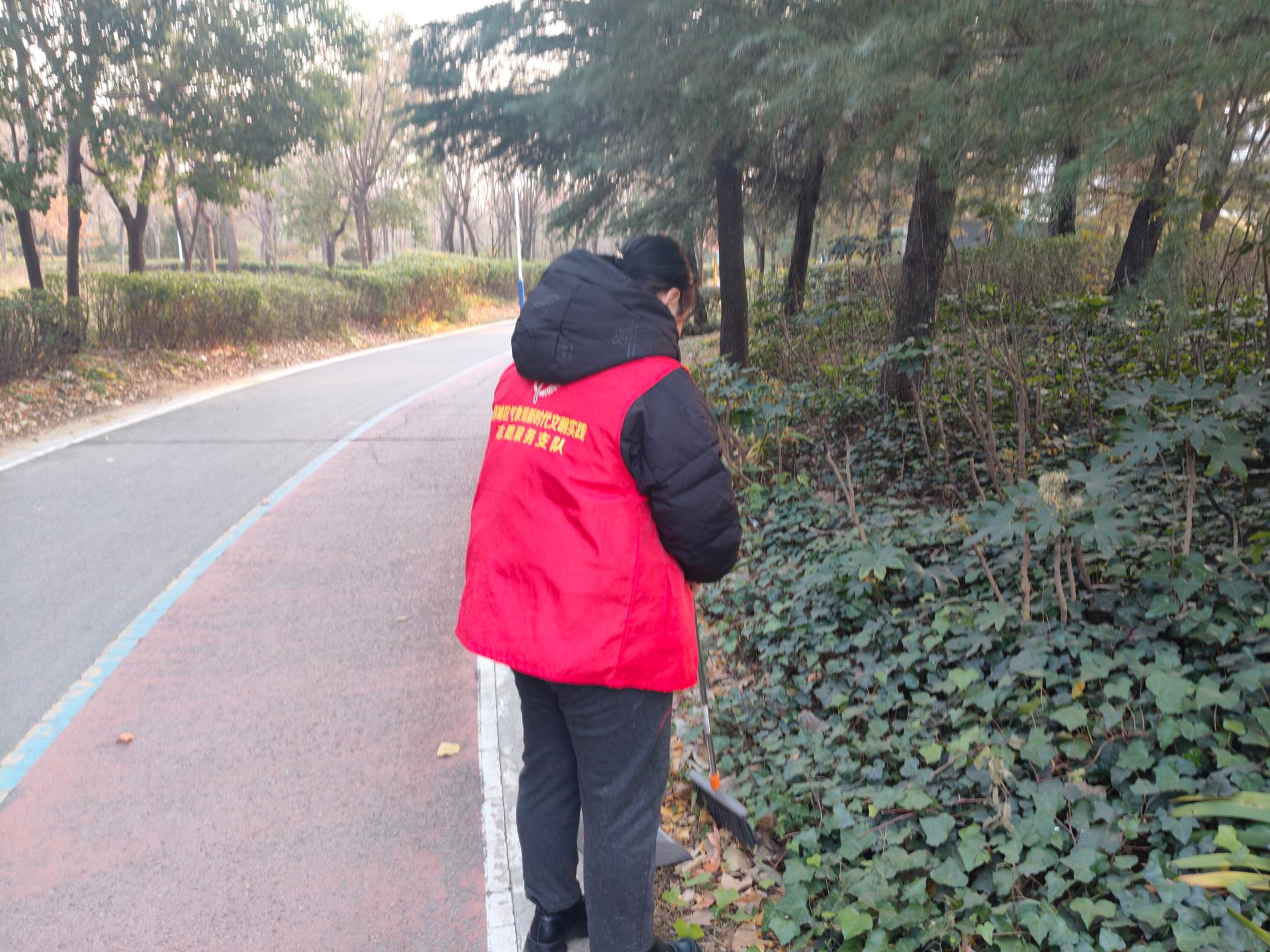 枣庄市薛城区气象局志愿服务活动开展环境清理活动,清理森林公园纸屑、烟头、塑料袋等,维护社会环境,提升公众环保意识。