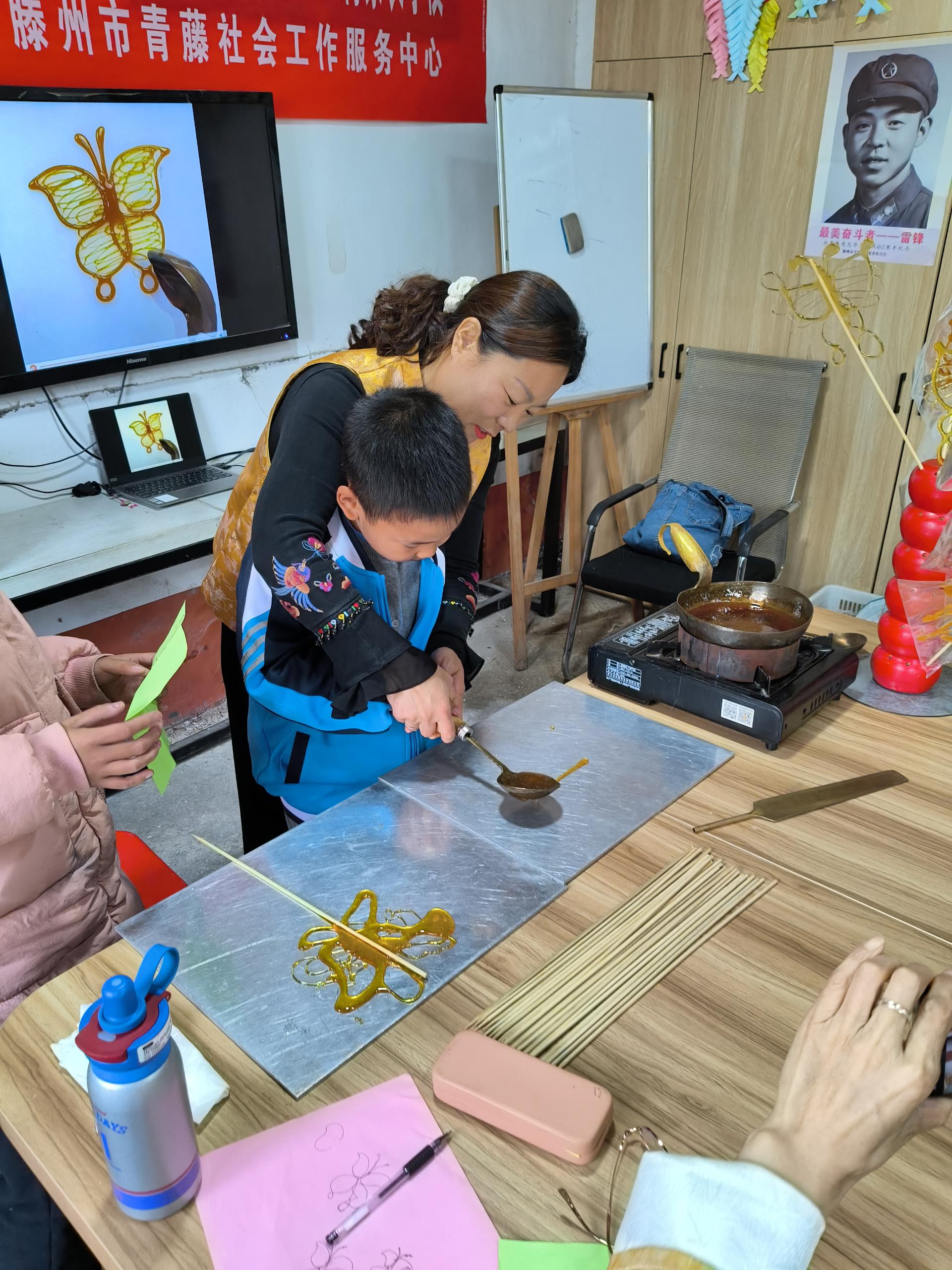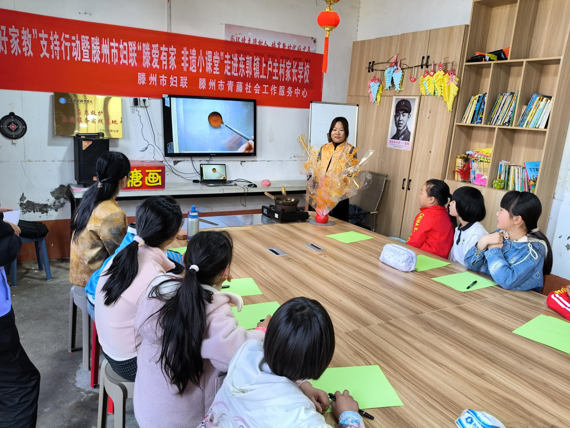 4月12日上午由市妇联组织的非遗糖画学习走进东郭镇上户主村,上户主爱心书屋志愿服务队组织留守儿童参加活动。