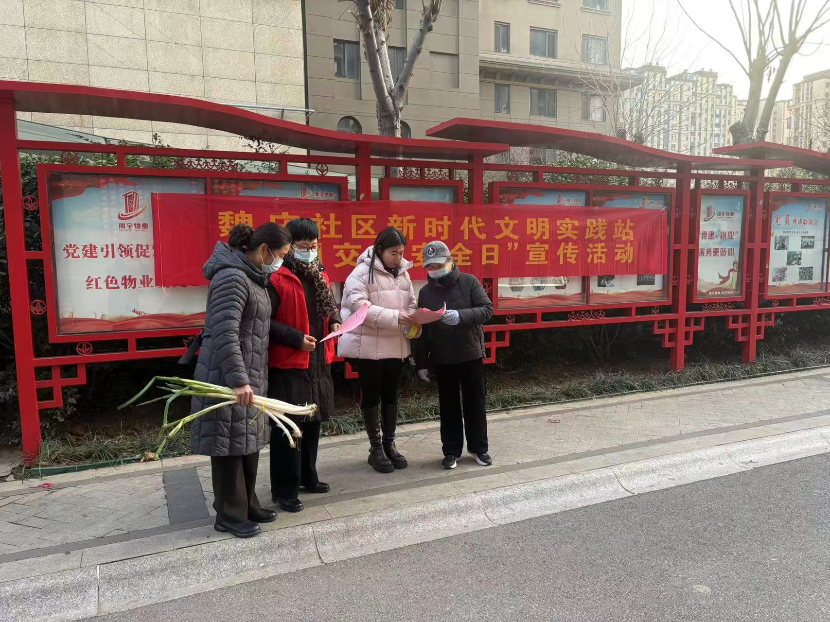 在全国交通安全日到来之际,在荆河街道魏庄社区新时代文明实践站党员志愿服务队开展“全国交通安全日 文明出行你我他”宣传教育活动,为增强社区居民的交通安全意识,共建文明出行的良好风气。