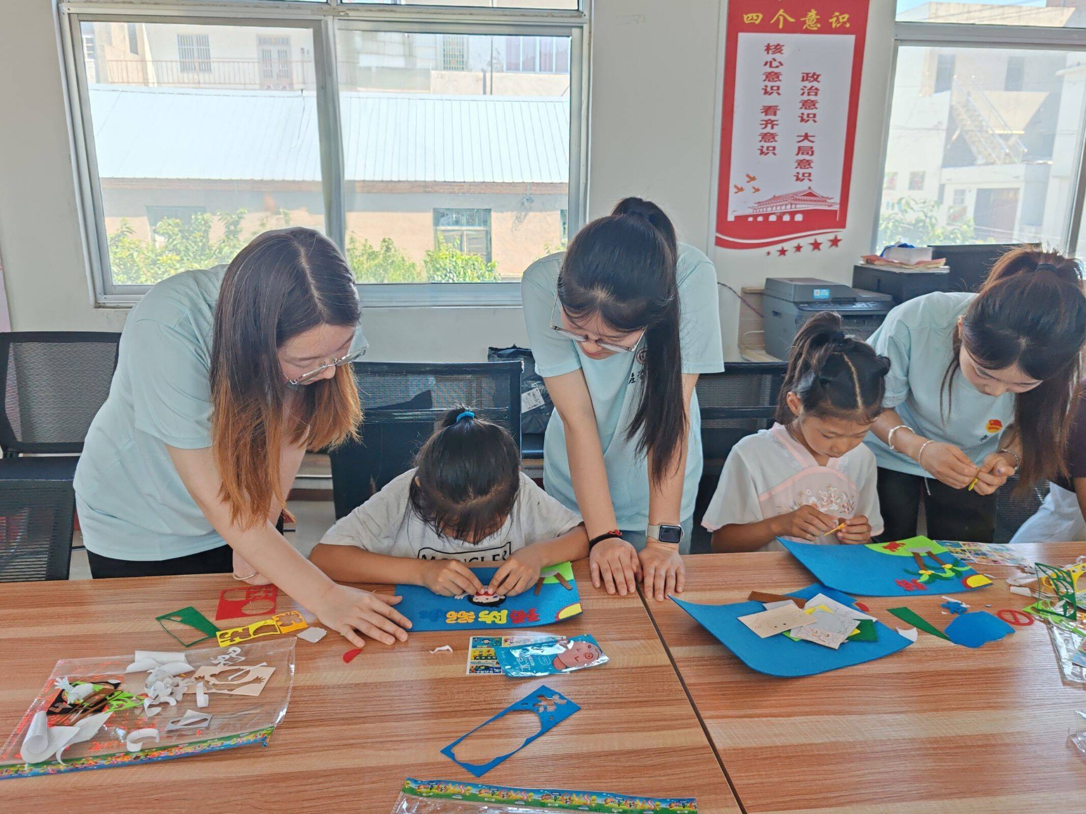 创意手工环节则化身为协作与创造的工坊。在大学生们耐心引导下,孩子们动手动脑,细心拼贴、折叠、创作。这一过程不仅锻炼了他们的动手能力和手眼协调,更在共同完成作品的过程中悄然培养了团队协作精神与解决问题的专注力。尤其值得一提的是,精心设计的“防溺水安全知识”主题拼图活动,将至关重要的生命安全教育融入趣味互动,让孩子们在动手拼接中牢记安全准则,筑牢暑期安全防线。