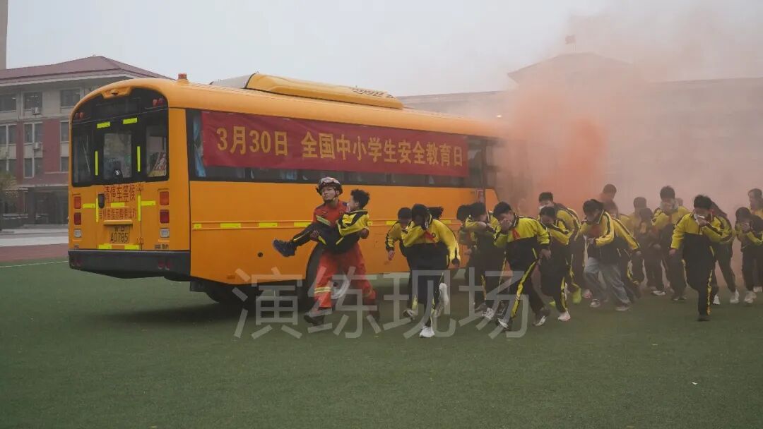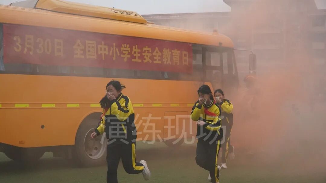 随后,现场组织学生利用校车开展应急疏散逃生演练。随着仿真烟雾的扩散,学生们弯腰捂鼻、快速有序撤离至安全区域。